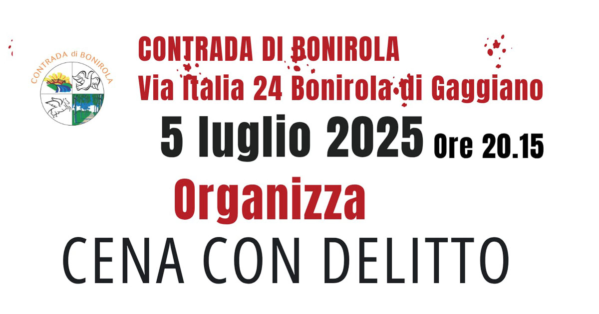 Sabato 5 luglio 2025 alle ore 20.15 a Bonirola di Gaggiano, via Italia 24 a Gaggiano, torna la Cena con Delitto a favore dell’Hospice di Abbiategrasso.